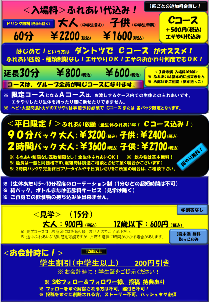 またCコースやパックの場合は、それぞれの子達に餌やりも可能ですが中には食べない子もいるので食べなかった場合は、ご了承下さい。