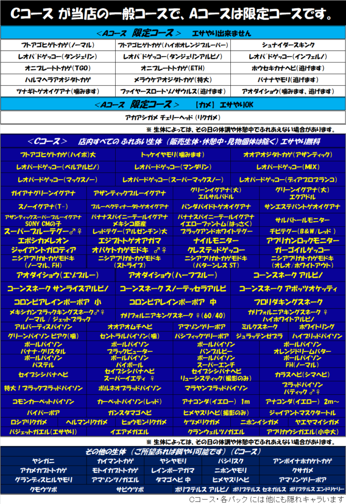 ※ 販売生体・エサの料金はこちら、爬虫類・両生類ホテルはこちら